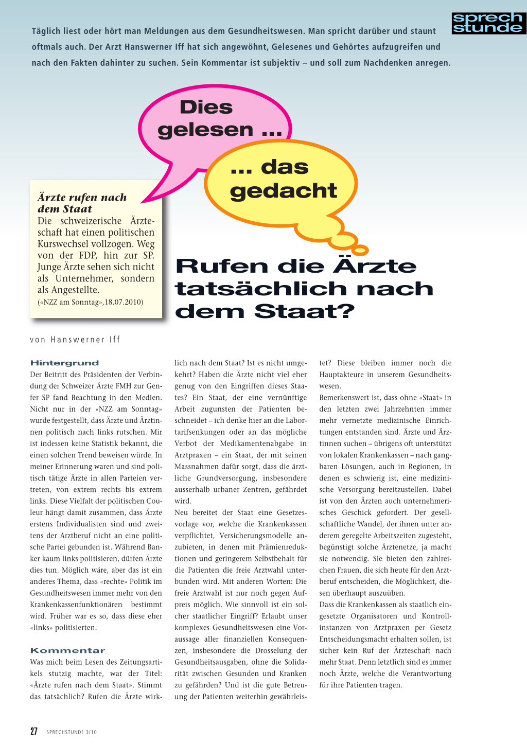Kommentar Was mich beim Lesen des Zeitungsartikels stutzig machte, war der Titel: «Ärzte rufen nach dem Staat». Stimmt das tatsächlich? Rufen die Ärzte wirk-