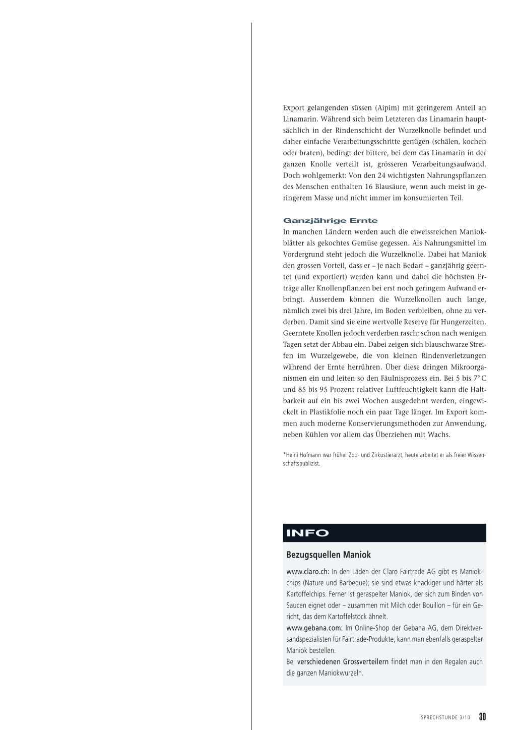 Export gelangenden süssen (Aipim) mit geringerem Anteil an Linamarin. Während sich beim Letzteren das Linamarin hauptsächlich in der Rindenschicht der Wurzelknolle befindet und daher einfache Verarbeitungsschritte genügen (schälen, kochen oder braten), bedingt der bittere, bei dem das Linamarin in der ganzen Knolle verteilt ist, grösseren Verarbeitungsaufwand. Doch wohlgemerkt: Von den 24 wichtigsten Nahrungspflanzen des Menschen enthalten 16 Blausäure, wenn auch meist in geringerem Masse und nicht immer im konsumierten Teil.
